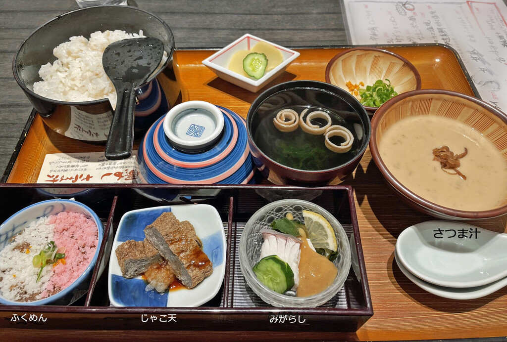 郷土料理の「さつま汁」「ふくめん」「じゃこ天」「みがらし」などの